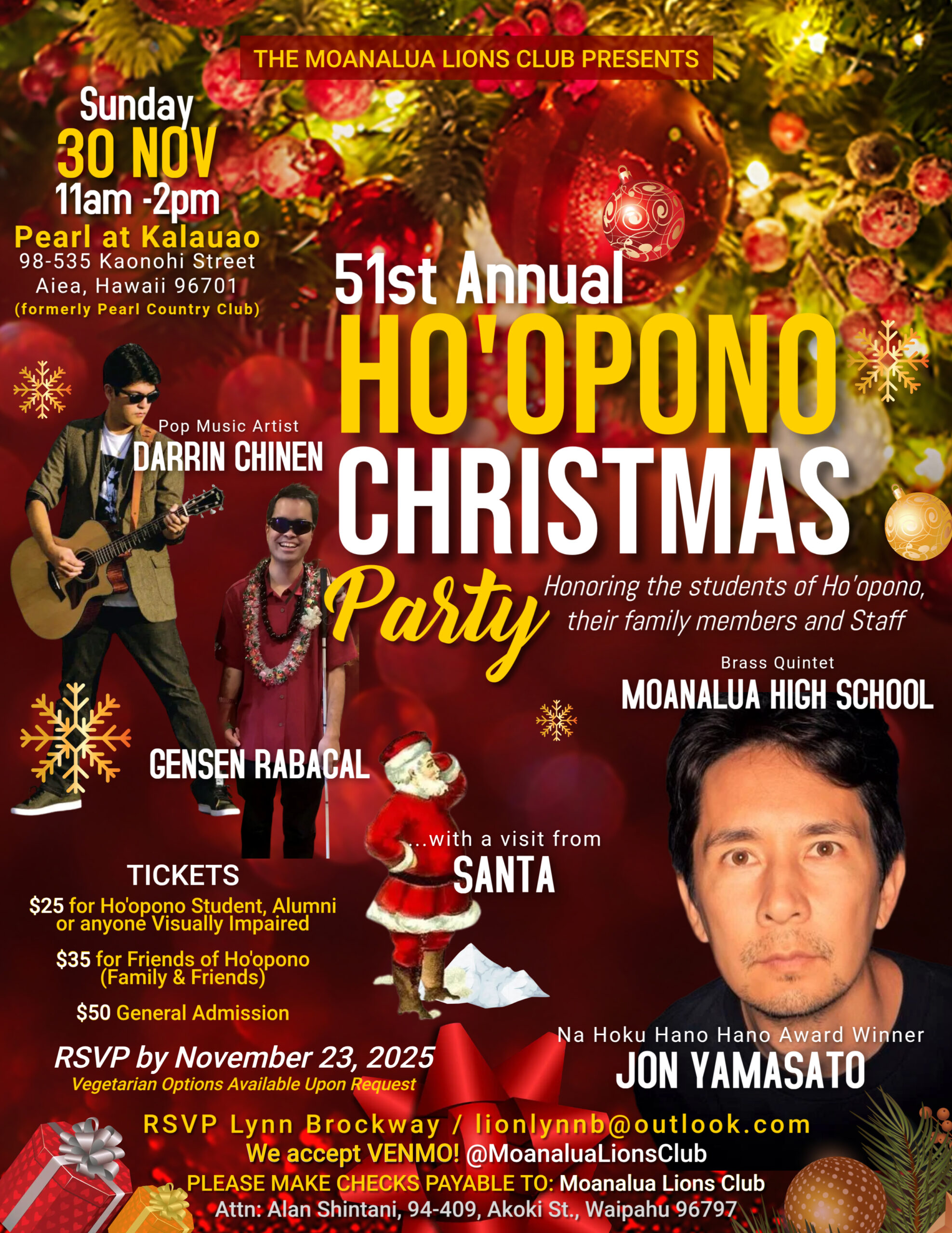 The Moanalua Lions Club proudly presents the 51st Annual Christmas Luncheon for Ho‘opono Services for the Blind at Pearl at Kalauao Golf Course. Enjoy live performances by Jon Yamasato, Darrin Chinen, Gensen Rabacal, and the Moanalua High School Brass Quintet, plus a special visit from Santa.