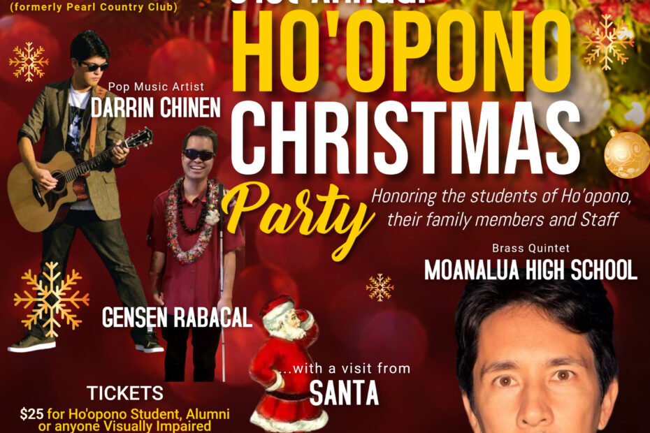 The Moanalua Lions Club proudly presents the 51st Annual Christmas Luncheon for Ho‘opono Services for the Blind at Pearl at Kalauao Golf Course. Enjoy live performances by Jon Yamasato, Darrin Chinen, Gensen Rabacal, and the Moanalua High School Brass Quintet, plus a special visit from Santa.